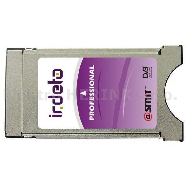 IRDETO CAM určený pro profesionální hlavní stanice. Umožňuje deskramblovat až 2 programy současně (počet programů je závislý na konfiguraci služby).
